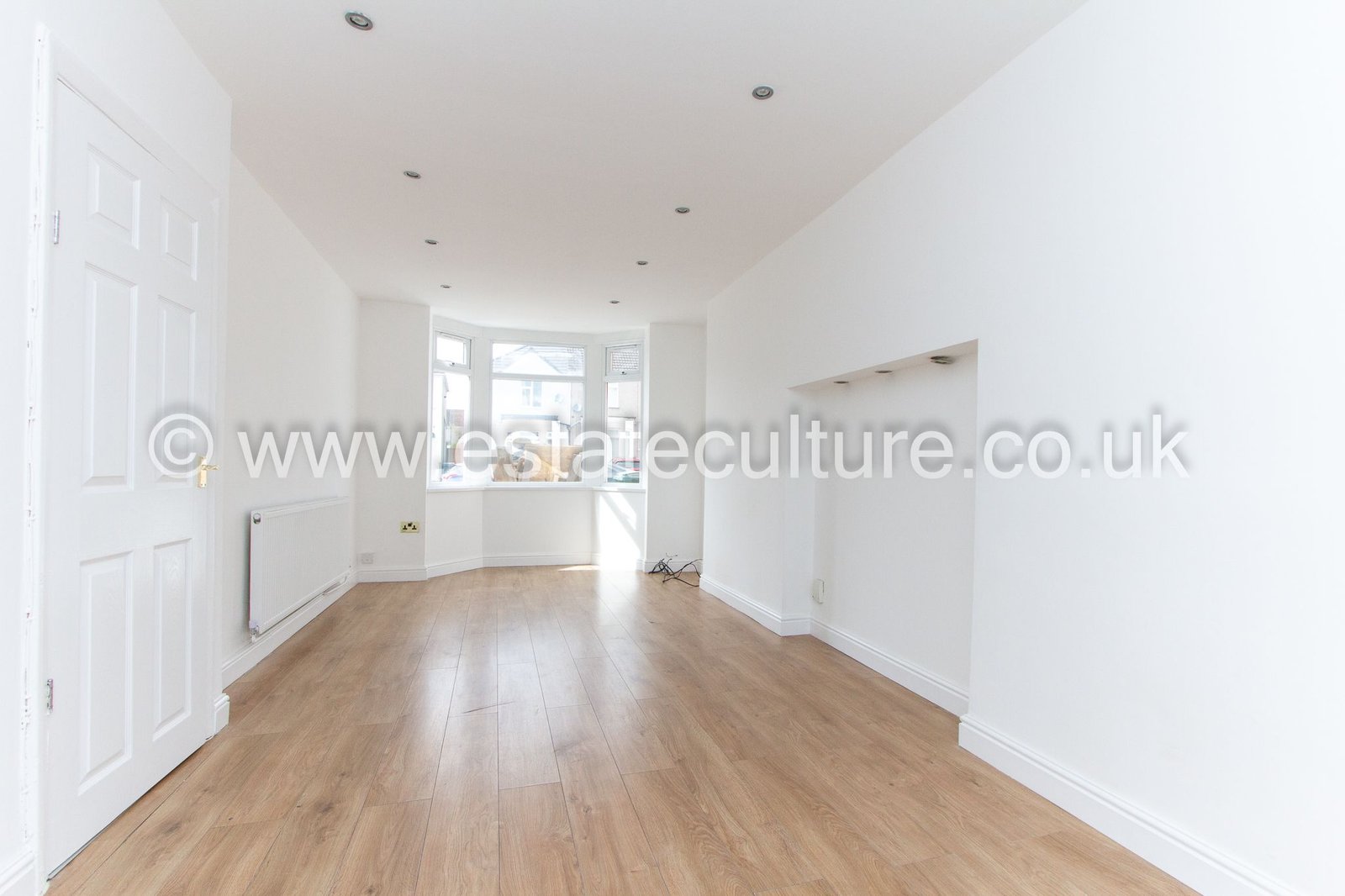 Modern Open-Plan Living: A spacious reception room featuring a bright bay window, spot-lit ceilings, and high-quality wood-effect flooring.