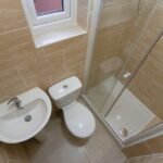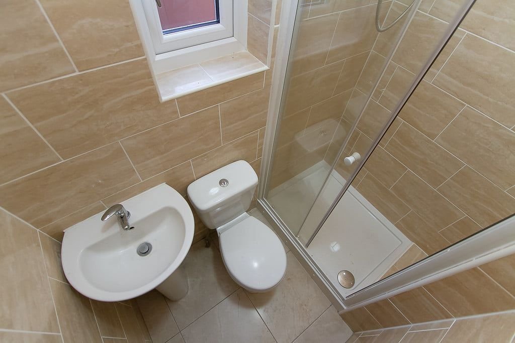 To the rear, the ground floor further benefits from a convenient shower room, featuring floor-to-ceiling sand-toned tiling and a modern walk-in enclosure.